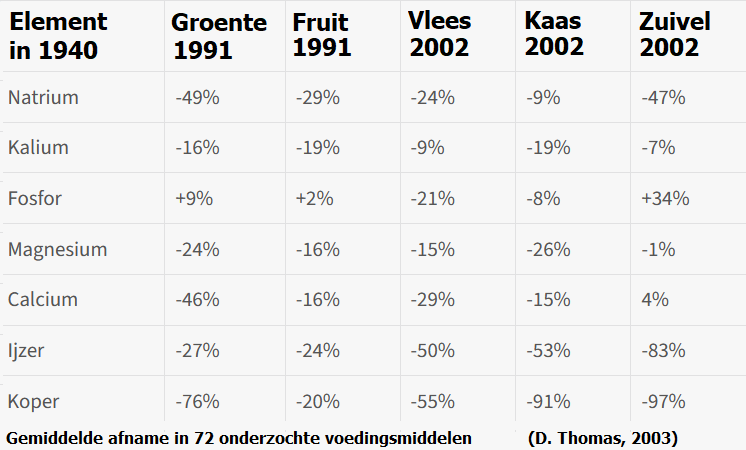 Door het bodemleven niet te beschermen graaft de industriële landbouw zijn eigen graf Die enorme overdosis aan fossiele energie die tussen 1950 en 2020 de bodem is ingepompt, heeft de conditie van de bodem op industrieel opererende landbouwbedrijven geen goed gedaan. Doordat de bodem niet werd beschermd tegen verzuring, uitloging en oxidatie kwam de humusvorming in de problemen, gingen bodemvruchtbaarheid en -structuur dus steeds verder achteruit en brak de industriële landbouw zijn eigen productiefactor (grond) langzaam af met teeltmethoden zonder respect voor het bodemleven! Een uitzichtloze situatie, die jaarlijks steeds meer eindige inputs vraagt, alleen al om de kunstmestverslaving van een leeggezogen bodem te onderhouden die van al zijn organische stof is ontdaan. Het betekent dat de industriële landbouw met open ogen op zijn eigen ondergang afkoerst, door geen afstand te willen doen van destructieve methoden van bodembeheer. Als men echter de opbrengsten van na 1950 zou analyseren op macro- en micro-nutriënten, zou blijken dat de micronutriënten in industrieel geteelde gewassen op spectaculaire wijze terrein hebben verloren. De bekende Geigy-analyse heeft daarvan al een voorproefje gegeven tussen 1985 en 2002. Hetzelfde geldt voor de rapportage van D. Thomas 2003 (tussen 1940 en 2002). Het wekt dus enige (maar niet heel veel) verbazing dat de overheid voor dit soort onderzoek betrekkelijk weinig interesse toont. Dit terwijl de industrie ondertussen wel een ondoorzichtige Nutri-Score in de benen mag helpen die gegevens over micronutriënten liever onder het vloerkleed veegt. De neergang in voedselkwaliteit als gevolg van een verdwijnend bodemleven Met het langzaam verdwijnen van micronutriënten uit industrieel geproduceerd voedsel begon in de Westerse wereld de neergang in kwaliteit van het gangbare voedselaanbod. De verminderende gezondheid van de Westerse mens heeft daar direct mee te maken. De grondoorzaak van het gezondheidsprobleem ligt in de gestadige vernietiging van het bodemleven, terwijl we juist afhankelijk zijn van een rijk en divers bodemleven,